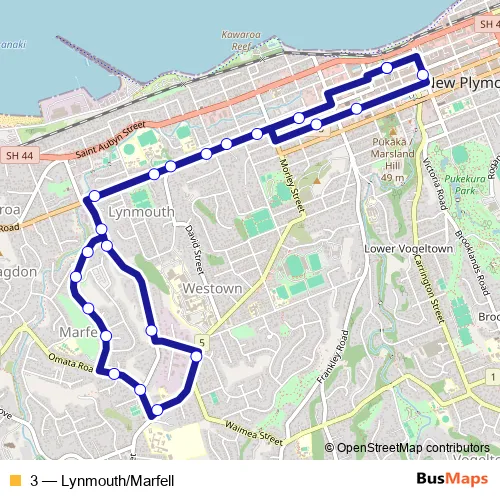 The first stop of the 3 bus route is Bay B - Ariki Street and the last stop is Bay B - Ariki Street. 3 (Lynmouth/Marfell) is operational during on weekdays.
