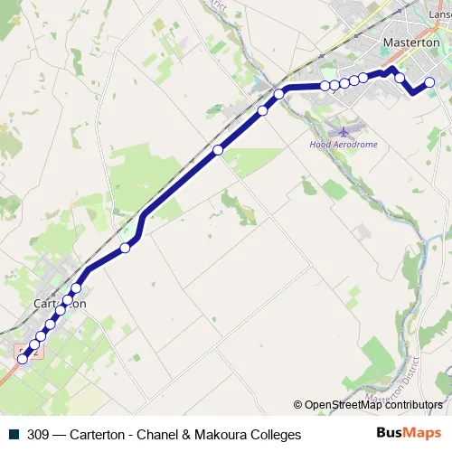 The first stop of the 309 bus route is Makoura College (school stop) and the last stop is Carterton - High Street South (near 439). 309 (Carterton - Chanel & Makoura Colleges) is operational during on weekdays.