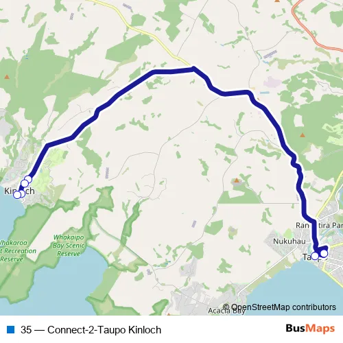 The first stop of the 35 bus route is Tongariri St, Taupo (Taupo Customer & Visitor Information Centre) and the last stop is Mata Pl, Kinloch (near Fire Station). 35 (Connect-2-Taupo Kinloch) is operational during everyday.