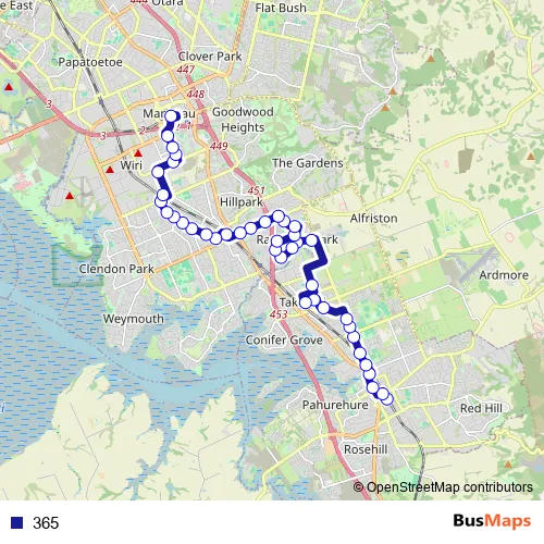 The first stop of the 365 bus route is Papakura Station and the last stop is Bay 18 Manukau Bus Station. 365 is operational during everyday.