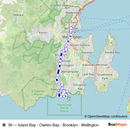 The first stop of the 39 bus route is Island Bay - Reef Street at Shorland Park and the last stop is Wellington Station - Stop E. 39 (Island Bay - Owhiro Bay - Brooklyn - Wellington) is operational during on weekdays.