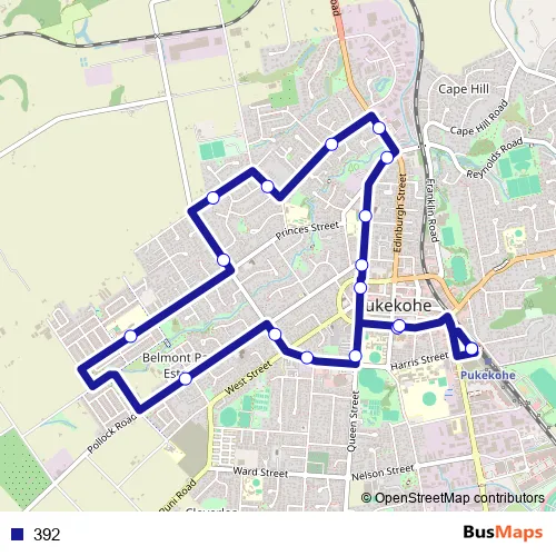 The first stop of the 392 bus route is Pukekohe Station and the last stop is