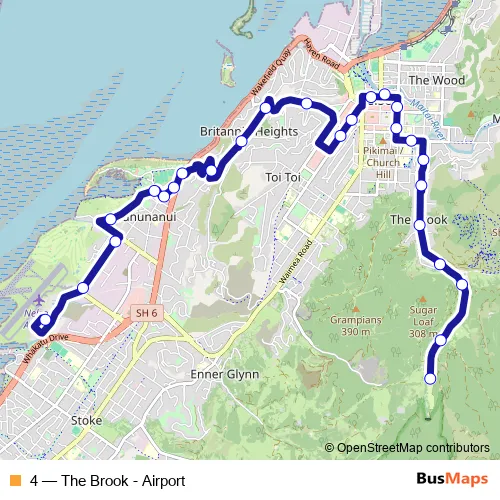 The first stop of the 4 bus route is Brook Valley Holiday Park and the last stop is Nelson Airport Terminal. 4 (The Brook - Airport) is operational during everyday.