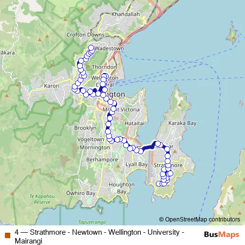 The first stop of the 4 bus route is Strathmore Park - Kekerenga Street and the last stop is Mairangi Road at Norwich Street. 4 (Strathmore - Newtown - Wellington - University - Mairangi) is operational during everyday.