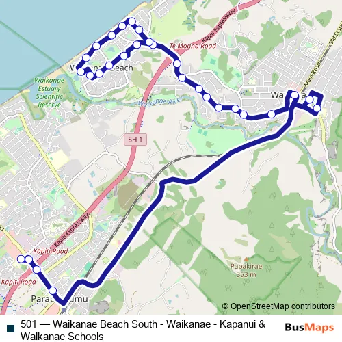 The first stop of the 501 bus route is Our Lady of Kāpiti School (school grounds) and the last stop is Waikanae Beach - Rauparaha Street. 501 (Waikanae Beach South - Waikanae - Kapanui & Waikanae Schools) is operational during on weekdays.