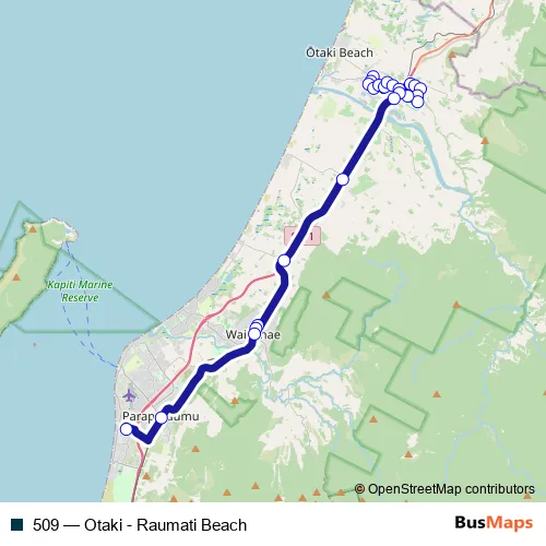 The first stop of the 509 bus route is Otaki Town - Aotaki Street at Mill Road and the last stop is Kāpiti College (School Stop). 509 (Otaki - Raumati Beach) is operational during on weekdays.