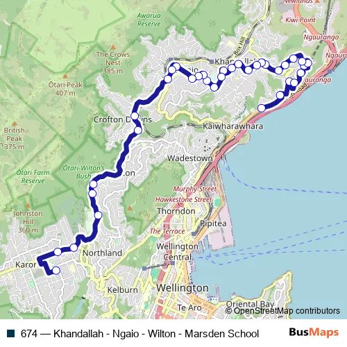 The first stop of the 674 bus route is Hutt Road at Rangiora Avenue and the last stop is Marsden School - Vera Street (school stop). 674 (Khandallah - Ngaio - Wilton - Marsden School) is operational during everyday.