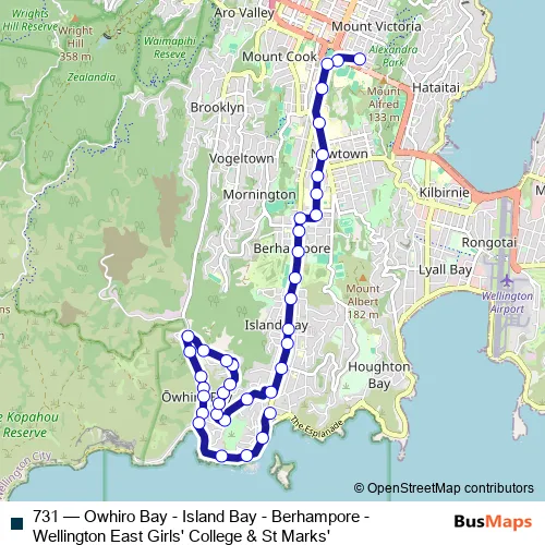 The first stop of the 731 bus route is Wellington East Girls' College - Ellice Street (school stop) and the last stop is Island Bay - Reef Street opposite Shorland Park. 731 (Owhiro Bay - Island Bay - Berhampore - Wellington East Girls' College & St Marks') is operational during everyday.
