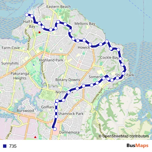 The first stop of the 735 bus route is Half Moon Bay Terminal and the last stop is Stop B Botany Town Centre. 735 is operational during everyday.