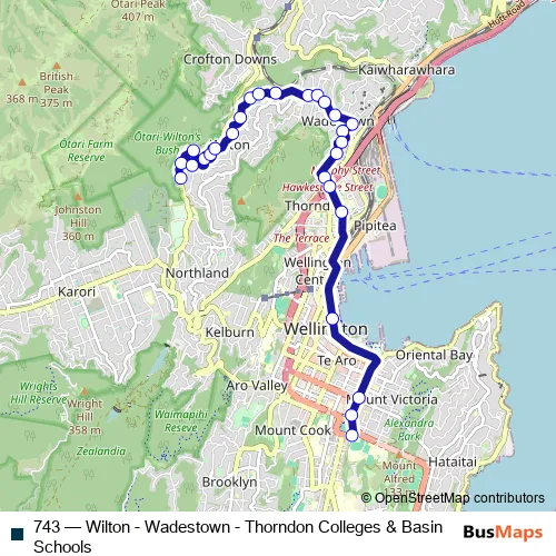 The first stop of the 743 bus route is Wilton - Surrey Street and the last stop is Basin Reserve (school stop). 743 (Wilton - Wadestown - Thorndon Colleges & Basin Schools) is operational during everyday.