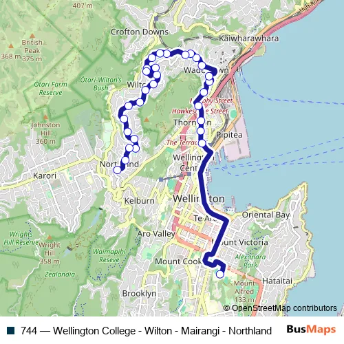 The first stop of the 744 bus route is Wellington College (school grounds) and the last stop is Northland Village - Northland Road. 744 (Wellington College - Wilton - Mairangi - Northland) is operational during everyday.