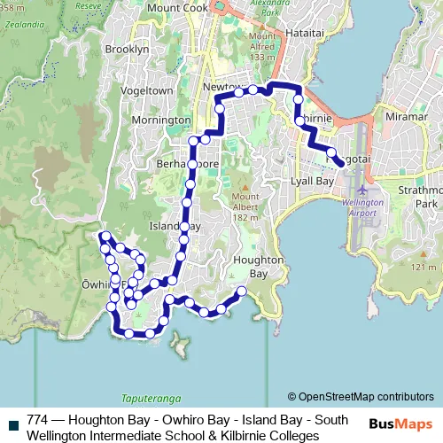 The first stop of the 774 bus route is Houghton Bay - The Esplanade and the last stop is Coutts Street at Rongotai College (school stop). 774 (Houghton Bay - Owhiro Bay - Island Bay - South Wellington Intermediate School & Kilbirnie Colleges) is operational during on weekdays.