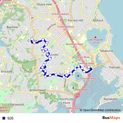 The first stop of the 926 bus route is Glenfield Mall and the last stop is Stop D Akoranga. 926 is operational during everyday.