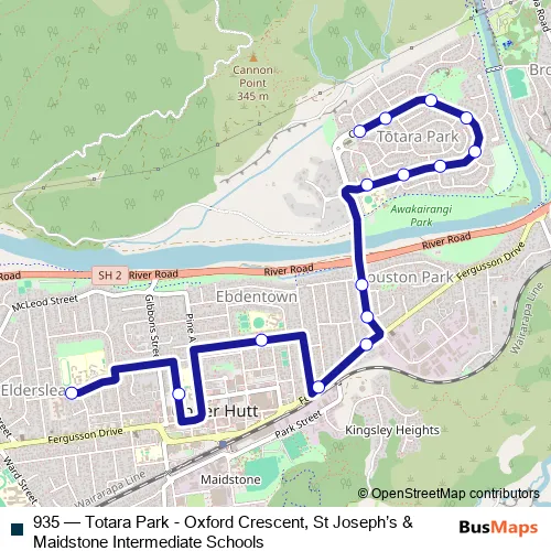The first stop of the 935 bus route is Maidstone Intermediate School (school stop) and the last stop is Totara Park - Tulsa Park. 935 (Totara Park - Oxford Crescent, St Joseph’s & Maidstone Intermediate Schools) is operational during on weekdays.