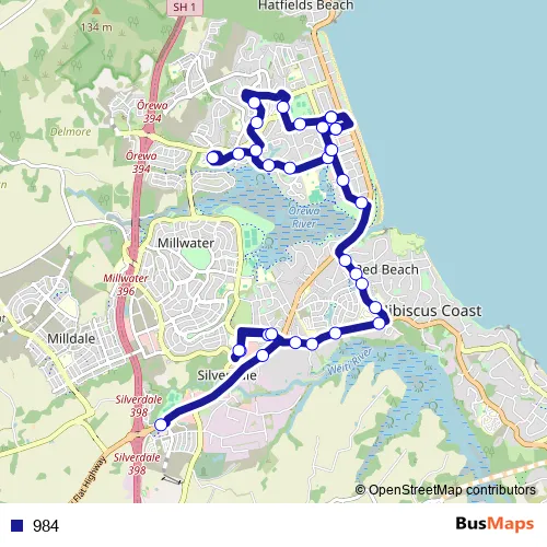 The first stop of the 984 bus route is Moana Avenue/Orewa Shops and the last stop is Stop B Hibiscus Coast. 984 is operational during everyday.