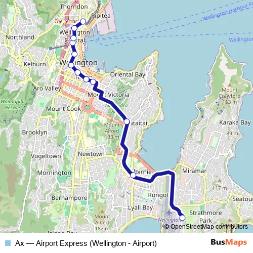 The first stop of the Ax bus route is Wellington International Airport and the last stop is Wellington Station - Stop E. Ax (Airport Express (Wellington - Airport)) is operational during everyday.
