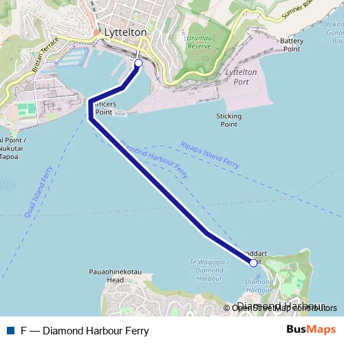 The first stop of the F bus route is Lyttelton Jetty and the last stop is Diamond Harbour Jetty. F (Diamond Harbour Ferry) is operational during everyday.