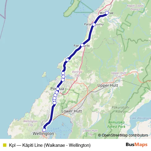 The first stop of the Kpl rail route is Wellington Station and the last stop is Waikanae Station. Kpl (Kāpiti Line (Waikanae - Wellington)) is operational during everyday.