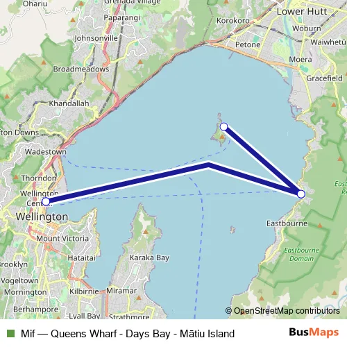 The first stop of the Mif ferry route is Queens Wharf and the last stop is Queens Wharf. Mif (Queens Wharf - Days Bay - Mātiu Island) is operational during everyday.