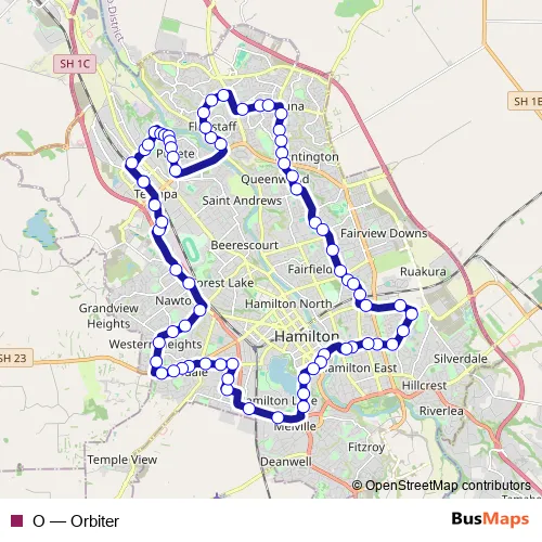 The first stop of the O bus route is Opp 129 Knighton Rd, Hamilton (University of Waikato Gate 2) and the last stop is Opp 129 Knighton Rd, Hamilton (University of Waikato Gate 2). O (Orbiter) is operational during everyday.