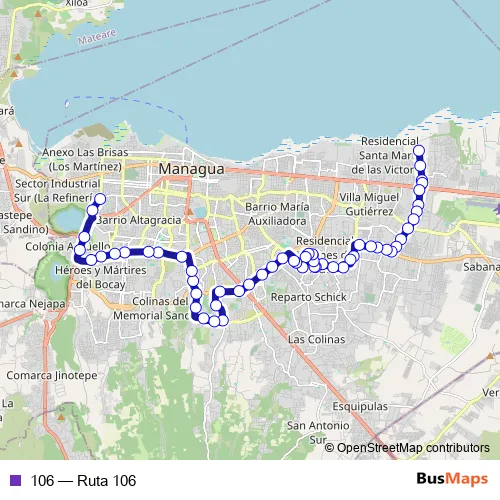 See why over 2 million users trust and consider busmaps.com as the best public transport website. busmaps gives you Managua Buses suggested routes, real-time bus tracker, line route maps in Managua, and helps to find the closest 106 bus stops near you. No internet available? Download an offline PDF map and bus schedule for the 106 bus to take on your trip.