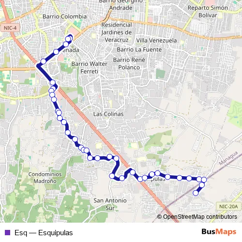 See why over 2 million users trust and consider busmaps.com as the best public transport website. busmaps gives you Managua Buses suggested routes, real-time bus tracker, line route maps in Managua, and helps to find the closest Esq bus stops near you. No internet available? Download an offline PDF map and bus schedule for the Esq bus to take on your trip.