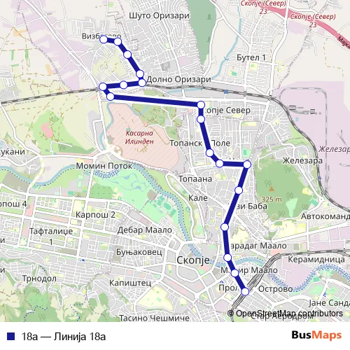 The first stop of the 18а bus route is Визбегово Т and the last stop is Транспортен Центар Т-Приградски Линии. 18а (Линија 18a) is operational during everyday.