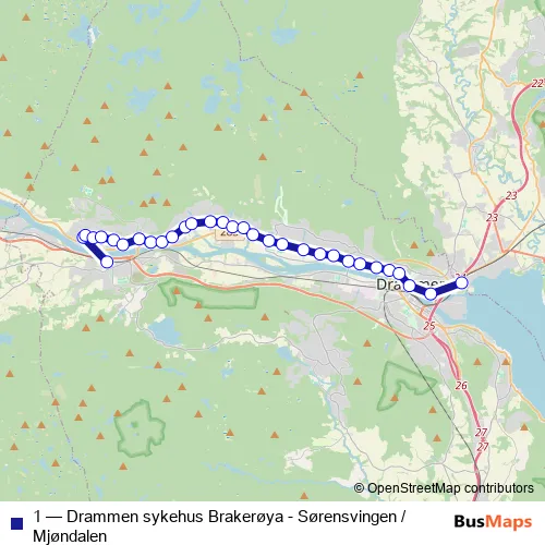 The first stop of the 1 bus route is Mjøndalen stasjon and the last stop is Drammen sykehus Brakerøya. 1 (Drammen sykehus Brakerøya - Sørensvingen / Mjøndalen) is operational during everyday.