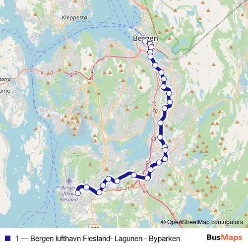 The first stop of the 1 tram route is Byparken and the last stop is Bergen lufthavn. 1 (Bergen lufthavn Flesland- Lagunen - Byparken) is operational during everyday.