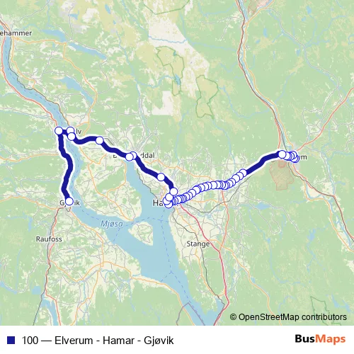 The first stop of the 100 bus route is Sykehuset Elverum and the last stop is Gjøvik skysstasjon. 100 (Elverum - Hamar - Gjøvik) is operational during everyday.