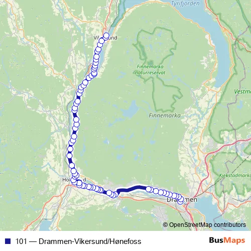 The first stop of the 101 bus route is Drammen busstasjon and the last stop is Vikersund bussterminal. 101 (Drammen-Vikersund/Hønefoss) is operational during everyday.