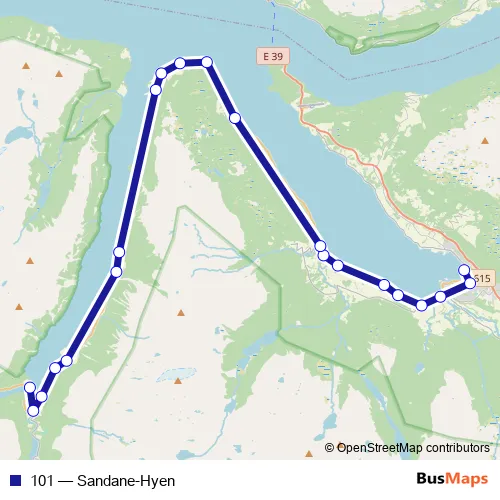 The first stop of the 101 bus route is Sandane rutebilstasjon and the last stop is Hyen. 101 (Sandane-Hyen) is operational during on weekdays.