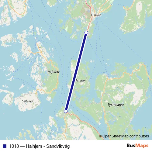 The first stop of the 1018 ferry route is Sandvikvåg ferjekai and the last stop is Halhjem ferjekai. 1018 (Halhjem - Sandvikvåg) is operational during everyday.