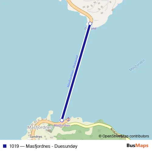 The first stop of the 1019 ferry route is Duesund ferjekai and the last stop is Masfjordnes ferjekai. 1019 (Masfjordnes - Duesundøy) is operational during everyday.