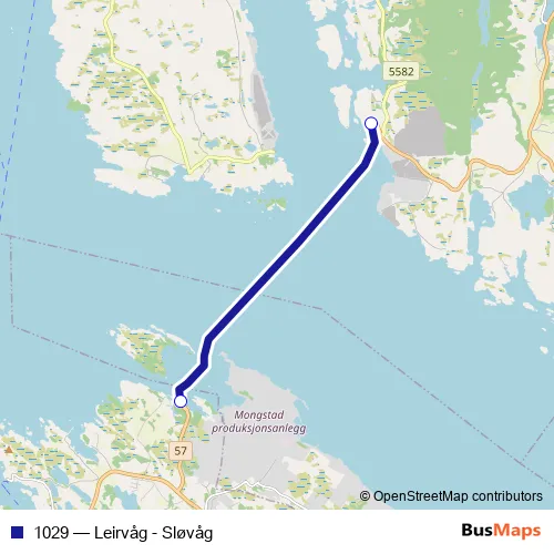 The first stop of the 1029 ferry route is Leirvågen ferjekai and the last stop is Sløvågen ferjekai. 1029 (Leirvåg - Sløvåg) is operational during everyday.
