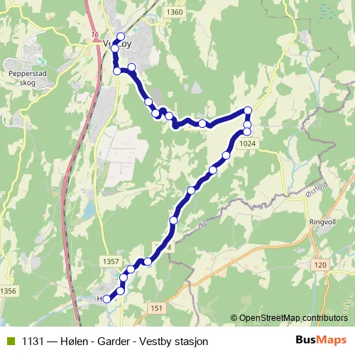 The first stop of the 1131 bus route is Vestby stasjon and the last stop is Hølen torg. 1131 (Hølen - Garder - Vestby stasjon) is operational during on weekdays.