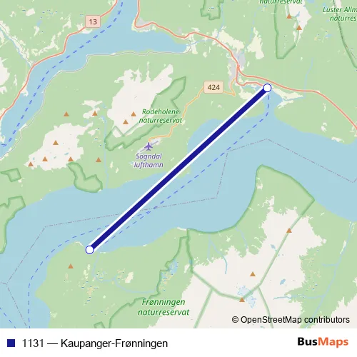 The first stop of the 1131 ferry route is Kaupanger ferjekai and the last stop is Frønningen ferjekai. 1131 (Kaupanger-Frønningen) is operational during everyday.