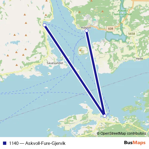 The first stop of the 1140 ferry route is Gjervik ferjekai and the last stop is Askvoll kai. 1140 (Askvoll-Fure-Gjervik) is operational during everyday.