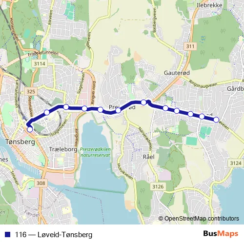 The first stop of the 116 bus route is Løveid and the last stop is Tønsberg rutebilstasjon. 116 (Løveid-Tønsberg) is operational during on weekdays.