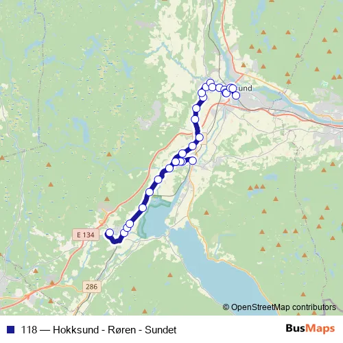 The first stop of the 118 bus route is Åleveien and the last stop is Hokksund stasjon. 118 (Hokksund - Røren - Sundet) is operational during on weekdays.