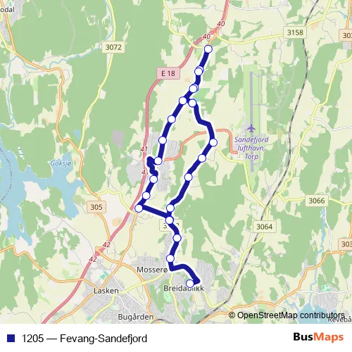 The first stop of the 1205 bus route is Åbol sag and the last stop is Breidablikk ungdomsskole. 1205 (Fevang-Sandefjord) is operational during on weekdays.