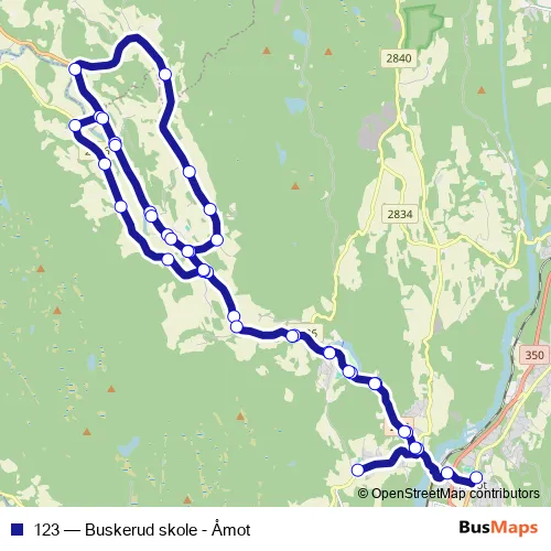 The first stop of the 123 bus route is Buskerud skole and the last stop is Åmot skysstasjon. 123 (Buskerud skole - Åmot) is operational during on weekdays.