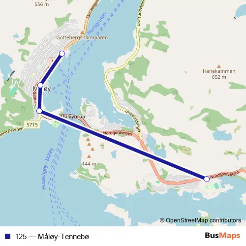 The first stop of the 125 bus route is Måløy vgs. and the last stop is Måløy terminal. 125 (Måløy-Tennebø) is operational during on weekdays.