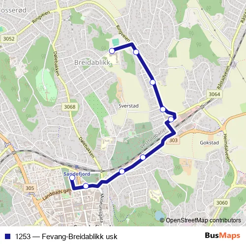 The first stop of the 1253 bus route is Breidablikk ungdomsskole and the last stop is Sandefjord rutebilstasjon. 1253 (Fevang-Breidablikk usk) is operational during everyday.