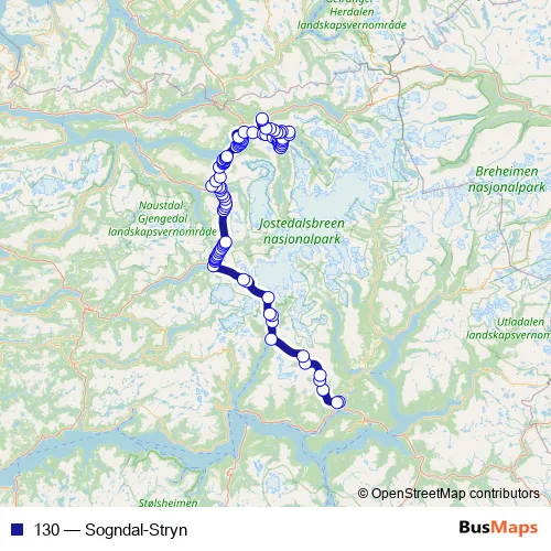 The first stop of the 130 bus route is Sogndal skysstasjon and the last stop is Stryn rutebilstasjon. 130 (Sogndal-Stryn) is operational during everyday.