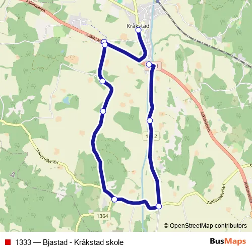 The first stop of the 1333 bus route is Kråkstad skole and the last stop is Asper bro. 1333 (Bjastad - Kråkstad skole) is operational during on weekdays.