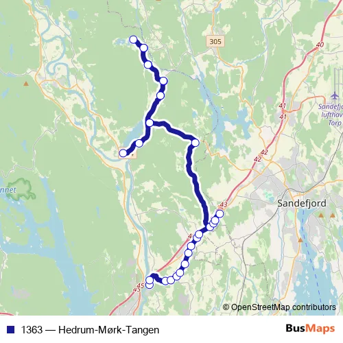 The first stop of the 1363 bus route is Hedrum barneskole and the last stop is Sundet. 1363 (Hedrum-Mørk-Tangen) is operational during on weekdays.