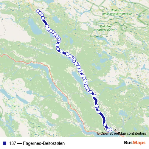 The first stop of the 137 bus route is Fagernes skysstasjon and the last stop is Beitostølen. 137 (Fagernes-Beitostølen) is operational during everyday.