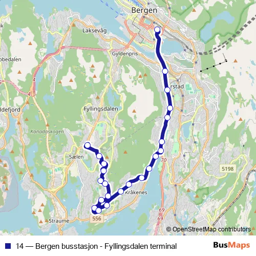 The first stop of the 14 bus route is Fyllingsdalen terminal and the last stop is Bergen busstasjon. 14 (Bergen busstasjon - Fyllingsdalen terminal) is operational during everyday.