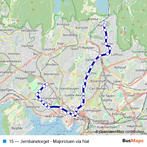 The first stop of the 15 tram route is Kjelsås and the last stop is Majorstuen. 15 (Jernbanetorget - Majorstuen via Nat) is operational during everyday.